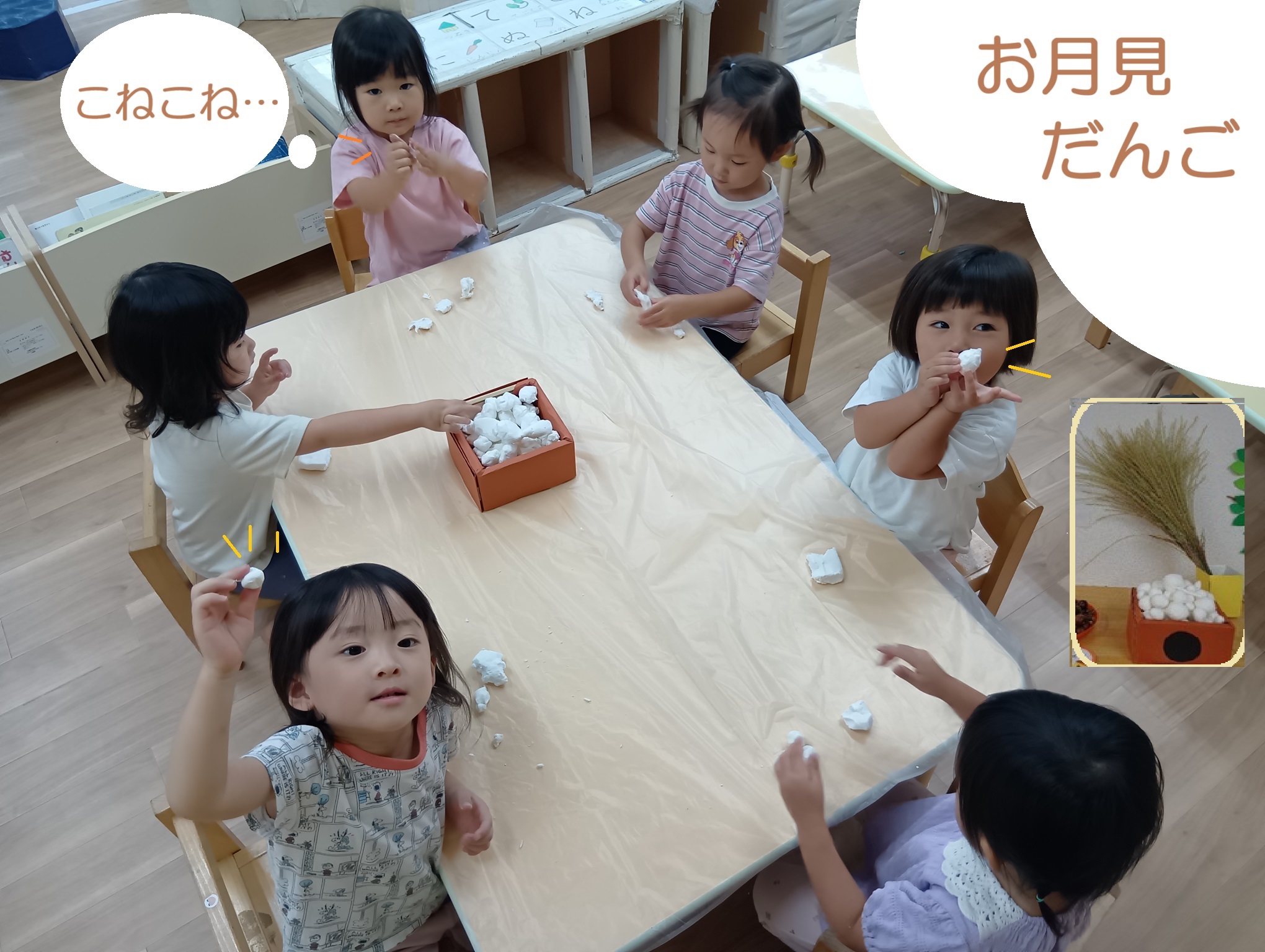 2歳児シリウスクラスでは粘土を丸めてお月見だんごづくりをして楽しみました!