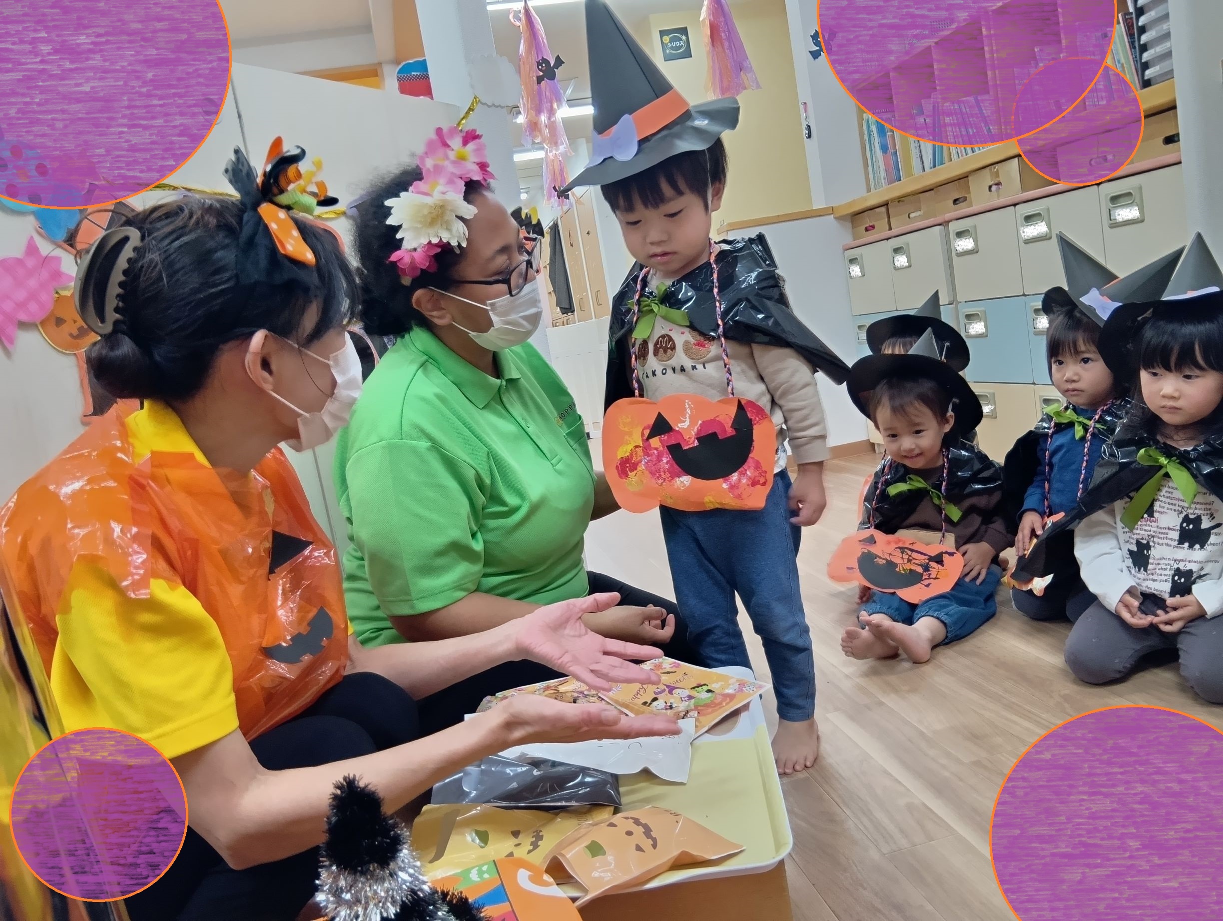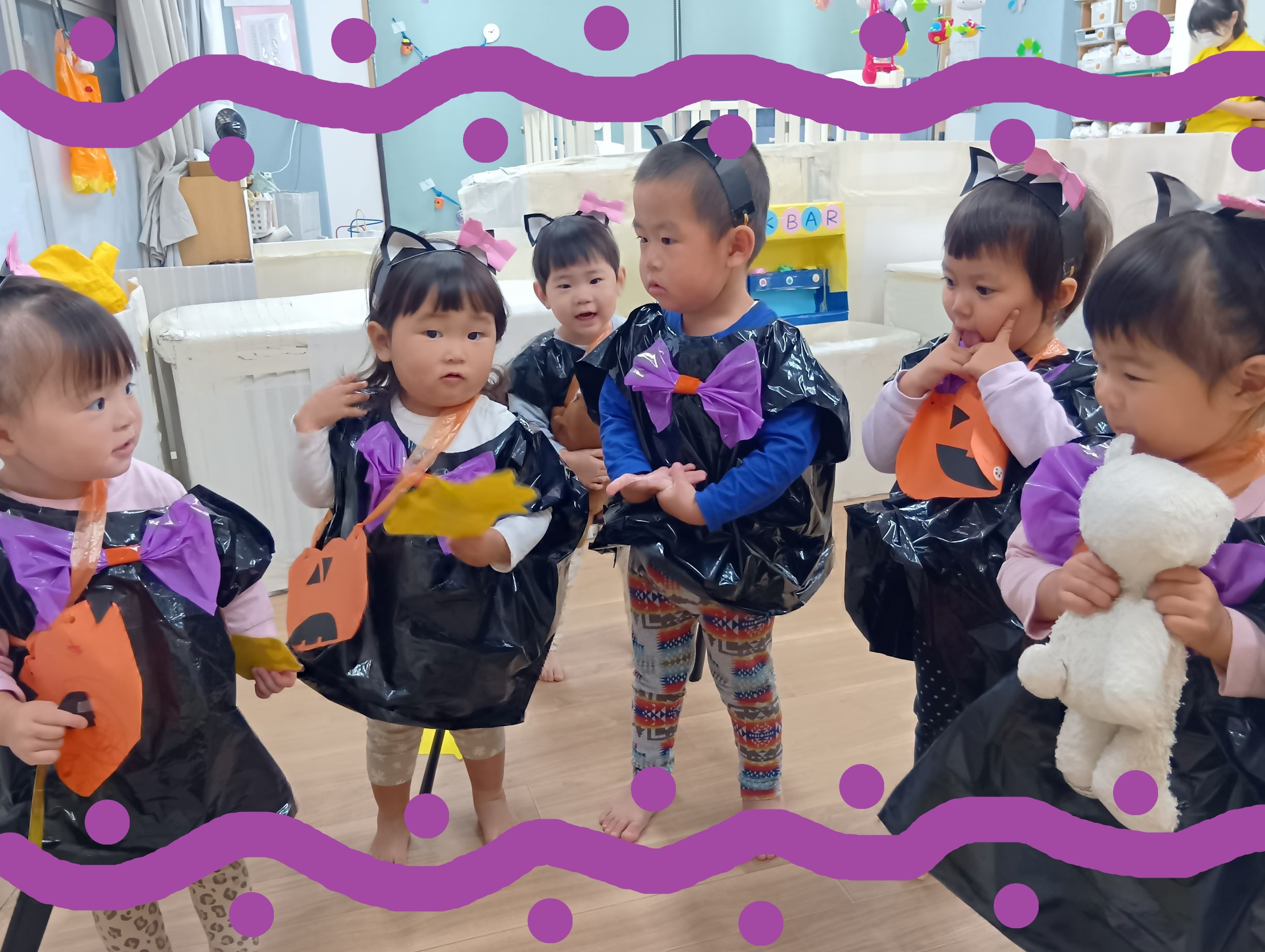 ハロウィンでは、異文化に触れながら行事を楽しむ気持ちや興味を育み、仮装や製作活動を通して創造力や表現する楽しさを感じられるようにしています。