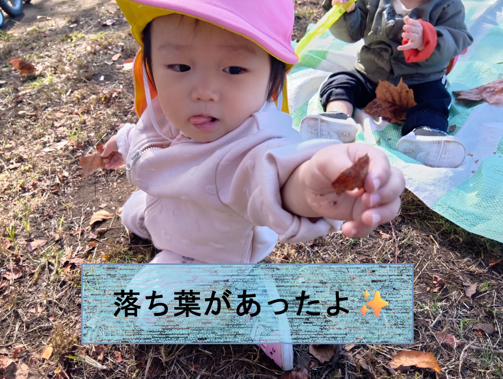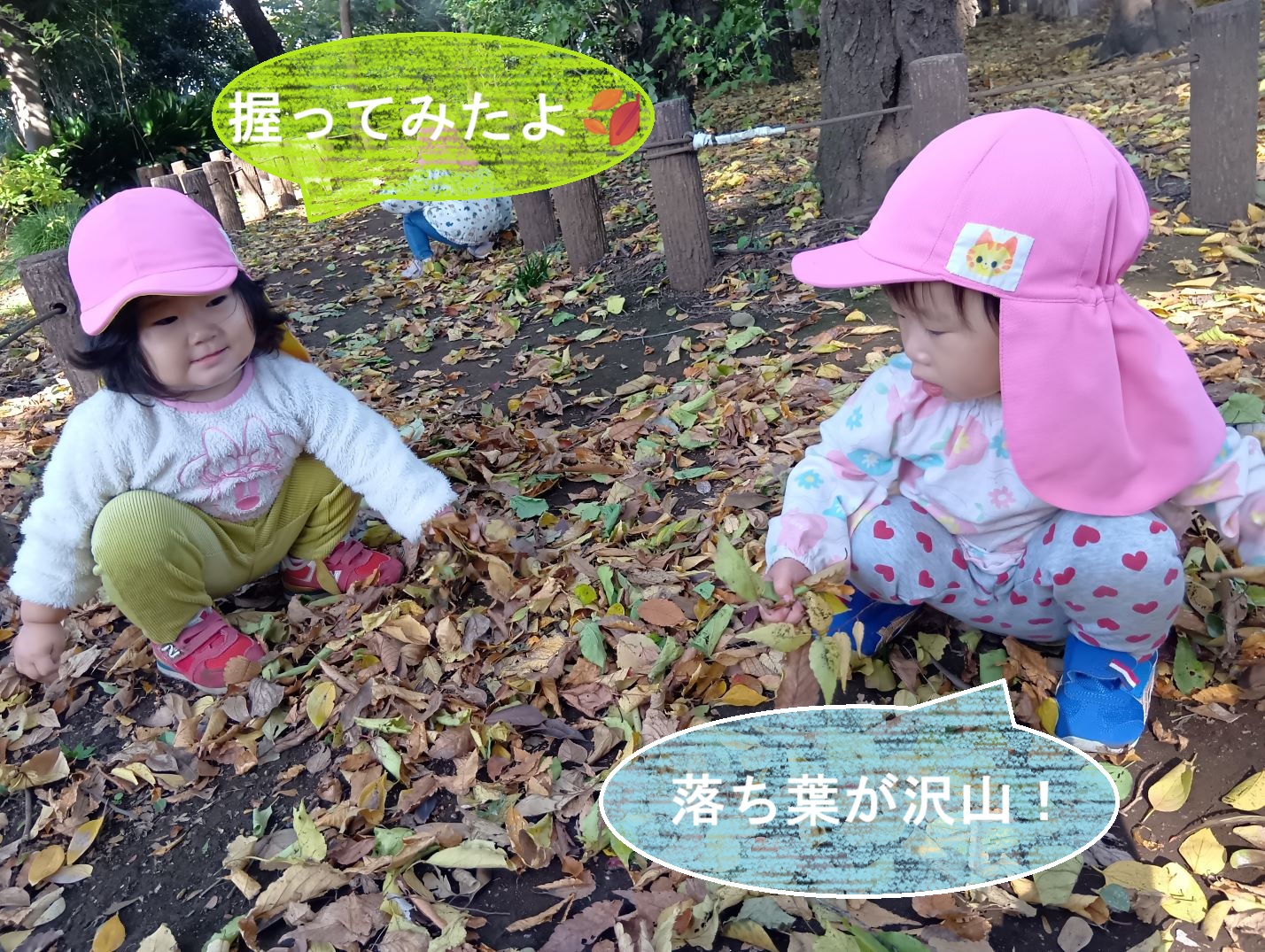 宙に浮かぶシャボン玉に手を伸ばしたり、落ち葉を手のひらに乗せ拾う→落とす を繰り返して遊んでいる姿がありますよ!