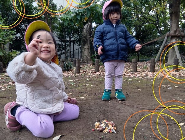 そばにいたお友だちも「これで食べるね」と枝を見せてくれて、丸い形に集めた落ち葉や木の実の自然物🍂をご飯に見立てて食べながら並行あそびを楽しんでいましたよ♪