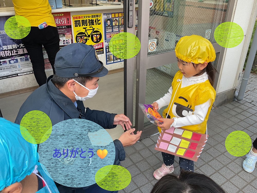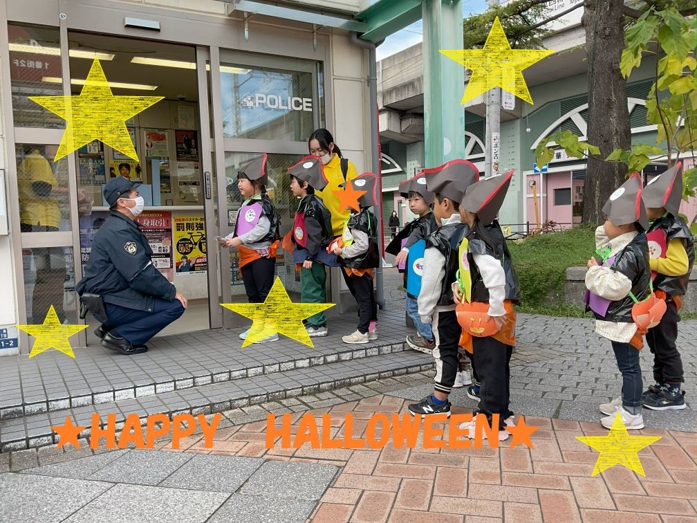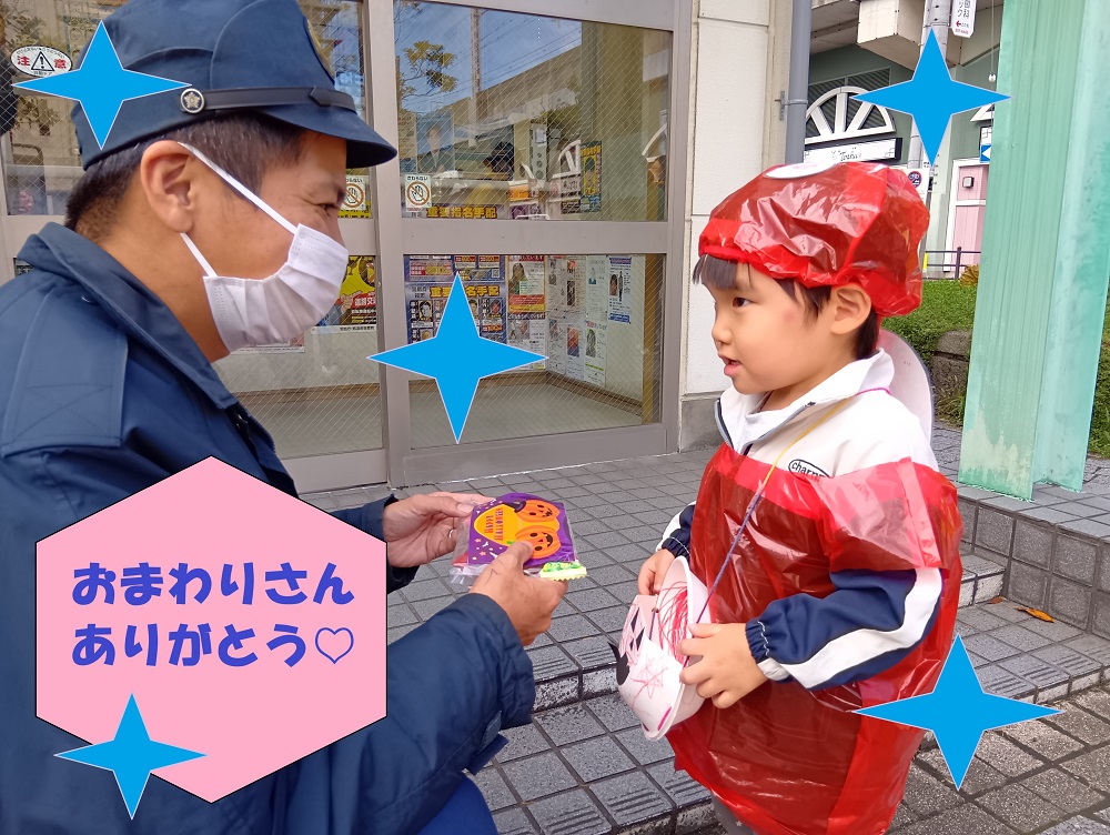 また、ハロウィン散歩の中で、すれ違う人に「トリックオアトリート」と言ったり、交番のご協力のもと警察官からお菓子を頂いたりして、地域の方との交流を深めることができました。