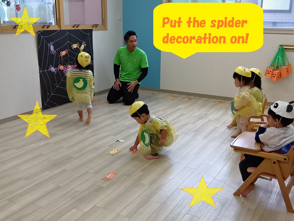 ニック先生の手作りのゲームでは、ニック先生に「Yellow spider」と言われるとしっかり色を理解して取ることができました!