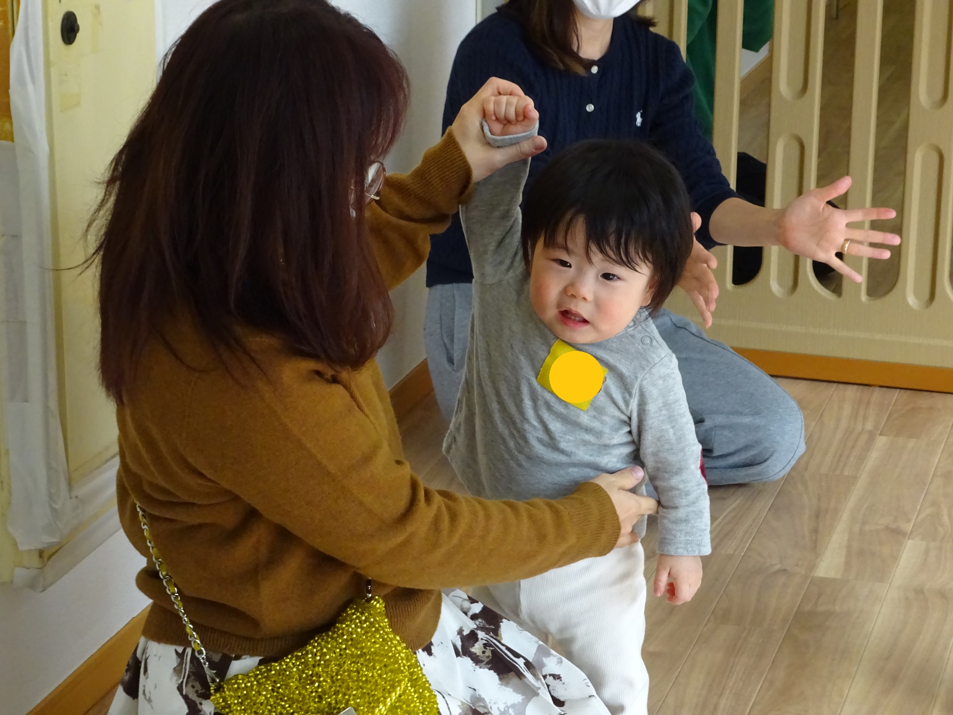 最初にピアノのリズムに合わせてひとりずつのお名前が呼ばれると保護者と一緒に手を挙げてこたえてくれました💛