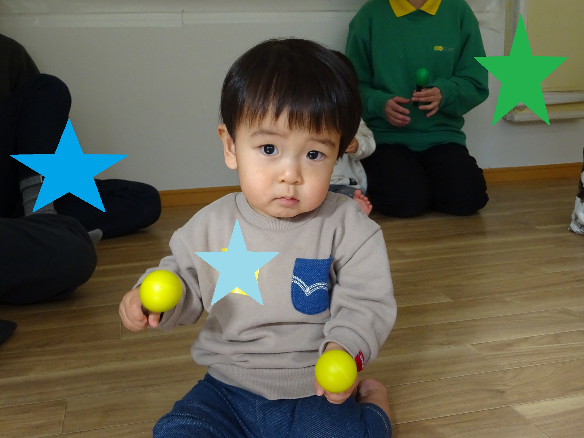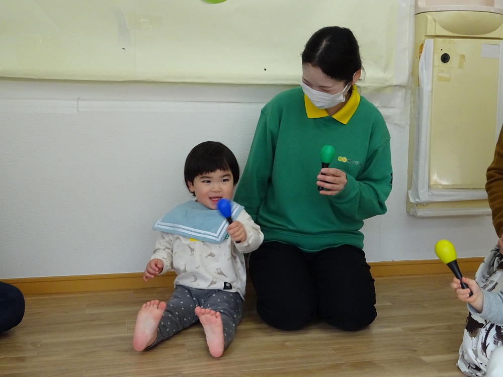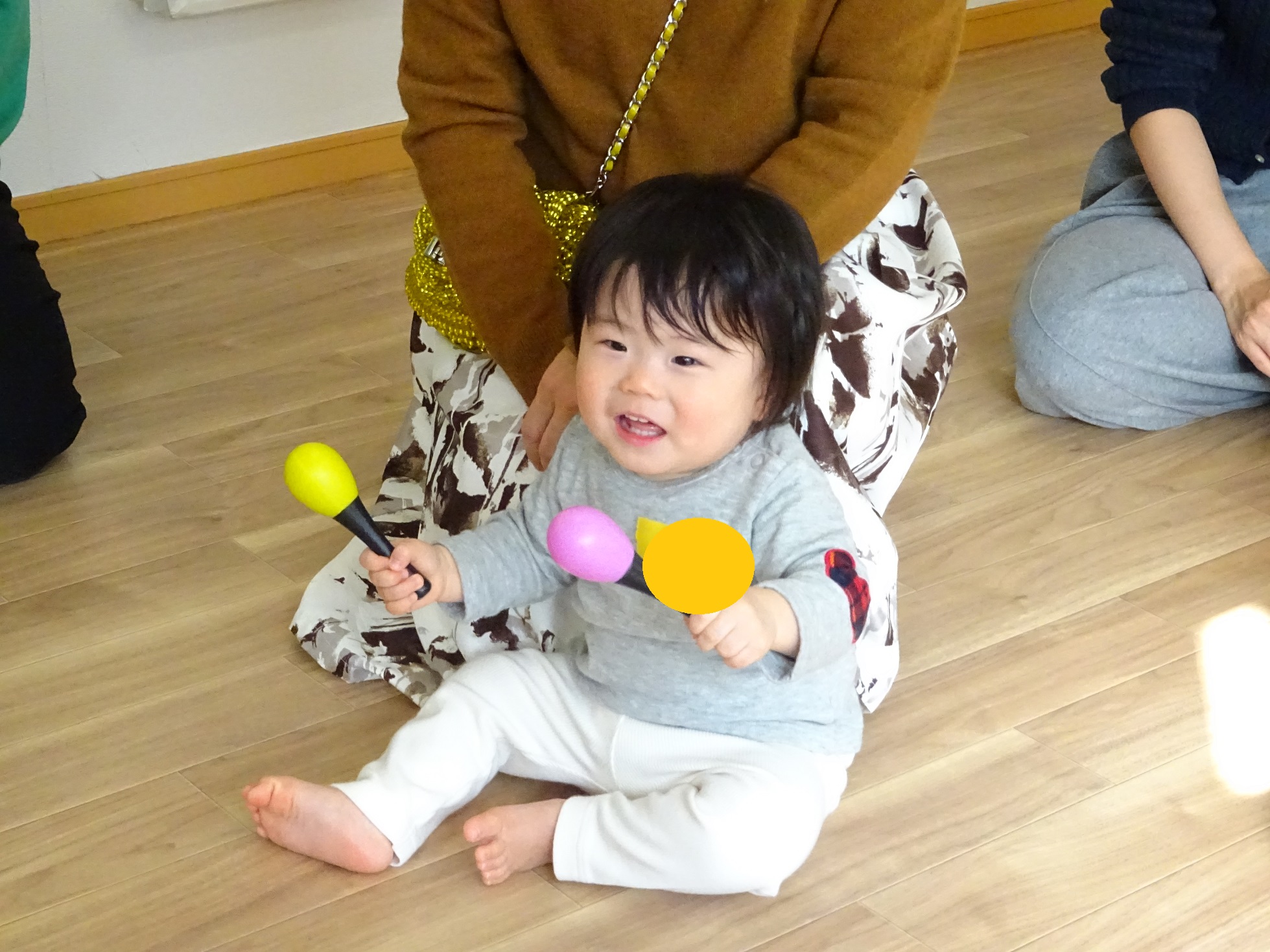 まずはじめに「手をたたきましょう」の歌に合わせてマラカスを鳴らしました。それぞれ好きな色を選び、色とりどりのマラカスを手に嬉しそうに鳴らしていました♪