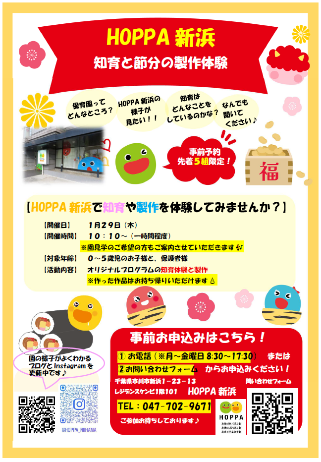 【千葉県市川市】園体験イベント開催のお知らせ~知育&節分製作~【HOPPA新浜】