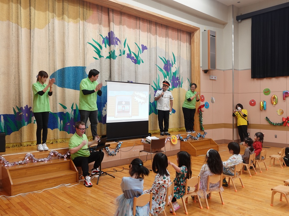 劇では、電車・バス・飛行機など、どんな乗り物で「どこへ向かうのか」を英語で子どもたちとやりとりをしています🎶