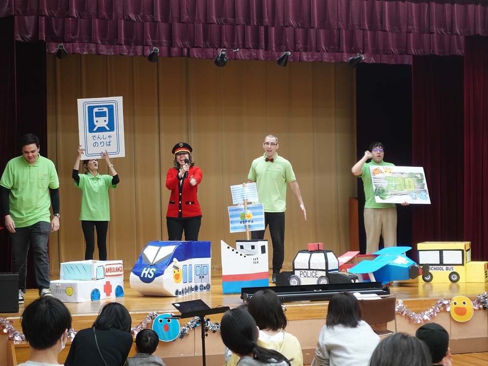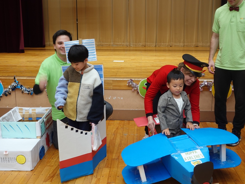 劇では、電車・バス・飛行機など、どんな乗り物で「どこへ向かうのか」を英語で子どもたちとやりとりをしています🎶