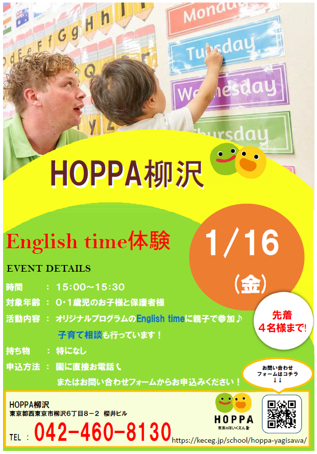 【西東京市】保育園体験イベント開催のお知らせ~English time体験~【HOPPA柳沢】