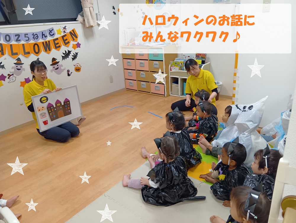 最初にハロウィンについてのお話を聞いたり、おばけマンションのペープサートを見ました!