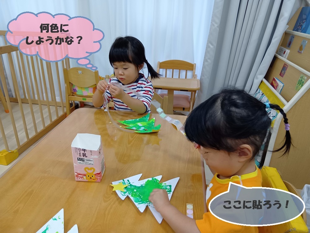 クリスマスツリーの飾り付けでは「どこしようかな?」と自分たちで好きな場所に飾り付け、「サンタさん見てくれるかな!」とクリスマス会を楽しみにしていましたよ。