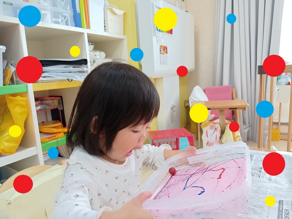 またオーナメント製作のビー玉転がしでは、保育者が絵の具同士の混ざっている様子を伝えるとじーっと見つめ「みどり色かな?」と考える姿も見られました。