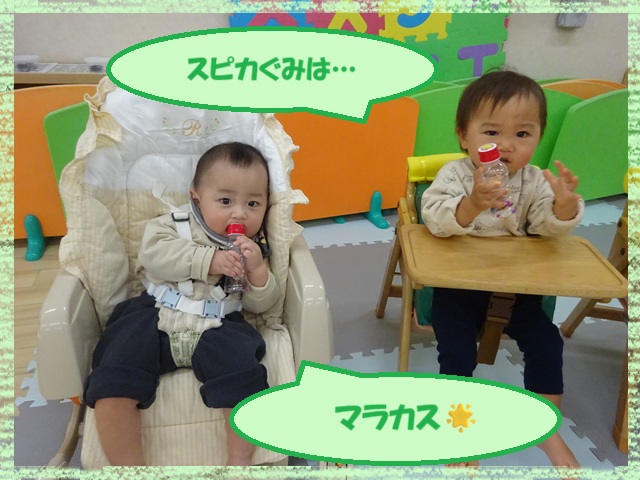 スピカ組(0歳児)さんは、お散歩のときに拾ったドングリを空容器に入れました。