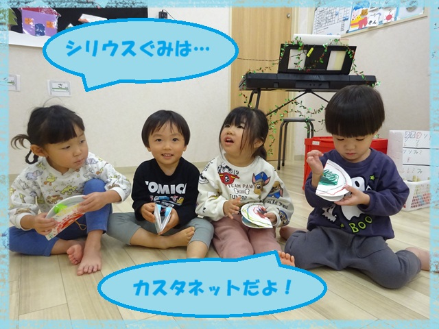 シリウス組(2歳児)さんは、紙皿で作ったカスタネットです。