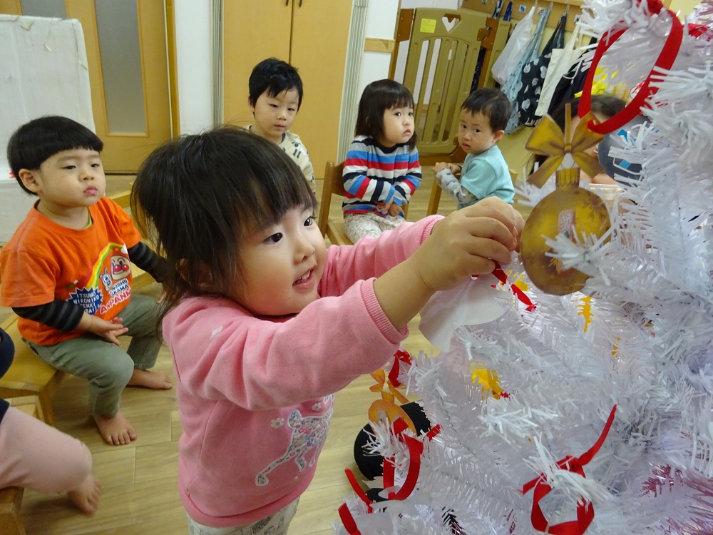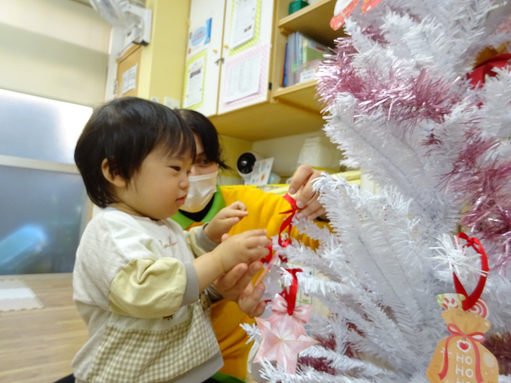 ひばりが丘南口保育園にクリスマスツリーが登場すると子どもたちは「おおきい!」「きれい!」と目を輝かせていました。