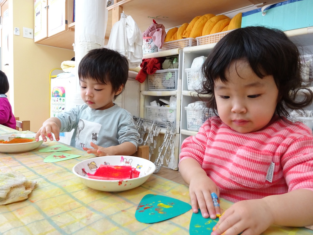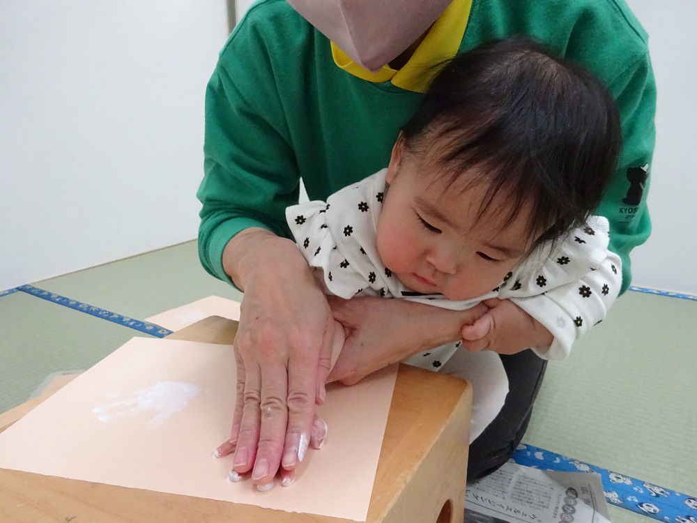 手に絵の具が付くと不思議そうにじっと見つめたり、そっと手を動かしてみたりして、一人ひとり様々な反応が見られました😊