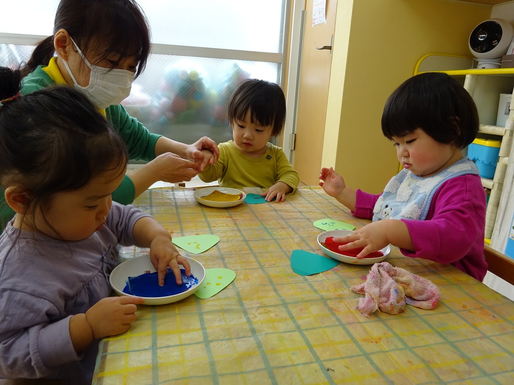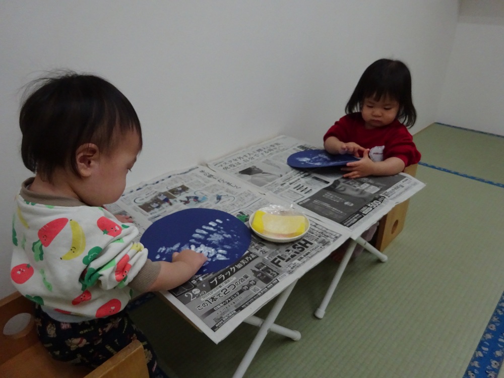 スピカ組(0歳児)では低月齢の子どもたちと、高月齢の子どもたちで違う作品作りをしました。