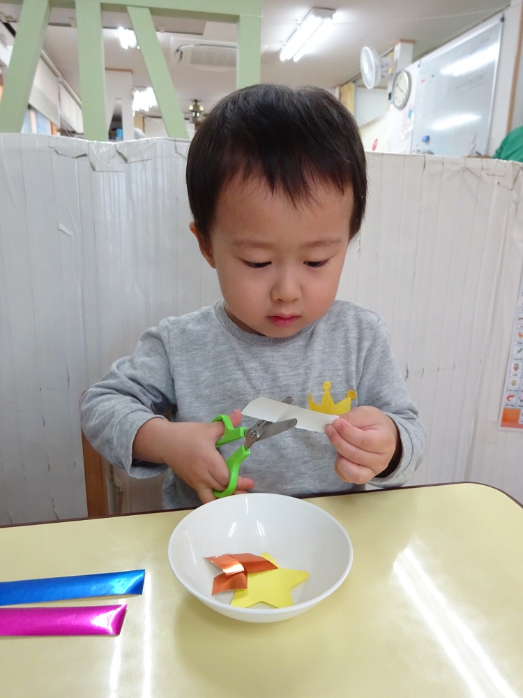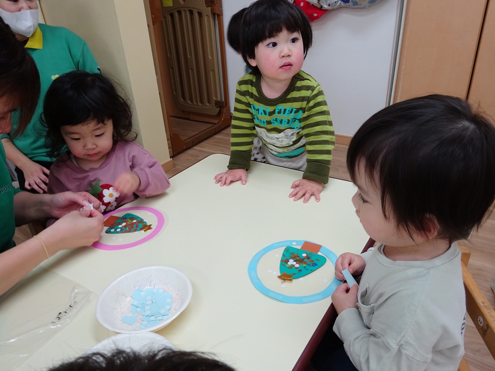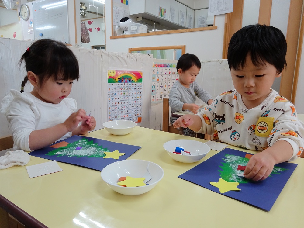 シリウス組(2歳児)はクリスマスツリーづくりを行いました。