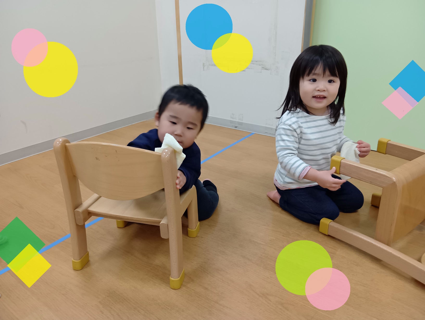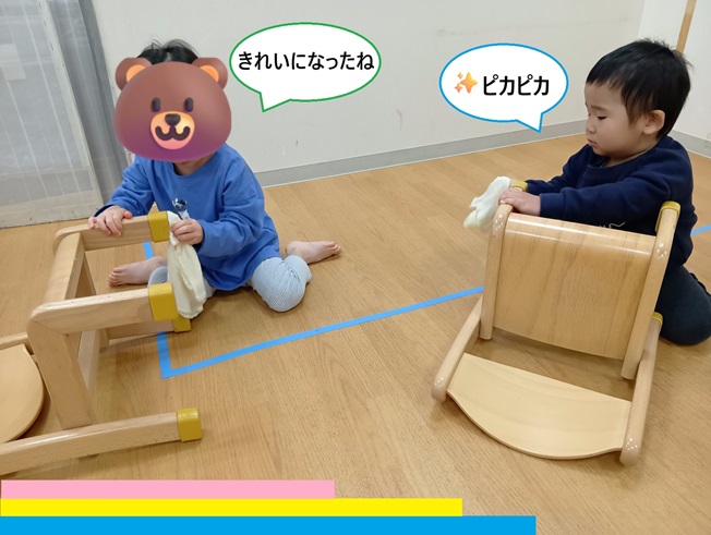 年末の大掃除の一つとしてシリウス組の子どもたちは自分で椅子や棚拭きをしました。