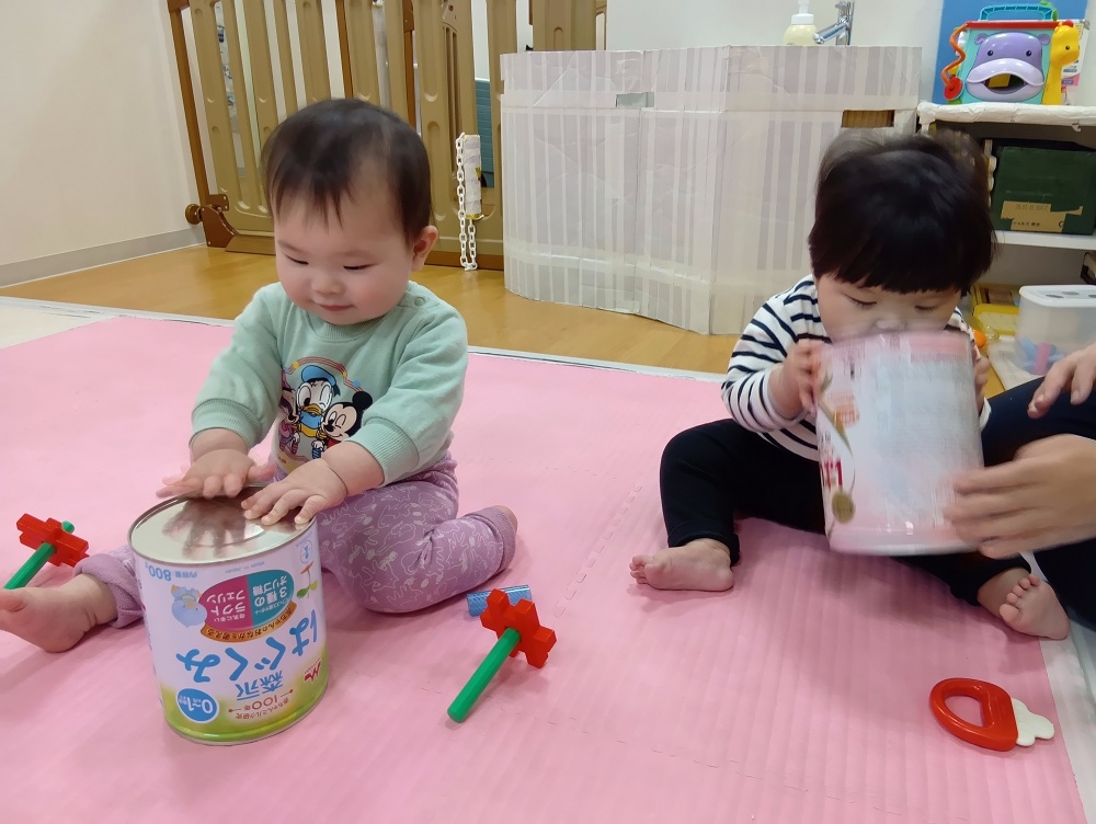 スピカ組さんはミルク缶に触れて覗いて、これ何だろう?から手でたたくと音が出ることを知り、想像力を働かせています。