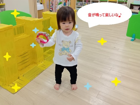 持っている手とは反対の手を拳にして手首を叩いて鳴らしたり♪シャララ~と回しながら鳴らしたりと自分たちで工夫して音楽表現を楽しんでいます。