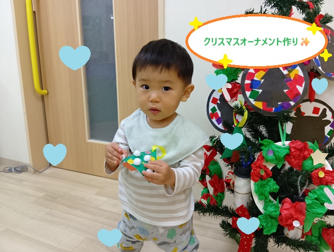 クリスマスツリーのオーナメント作りでは花紙のくしゃくしゃという感触を楽しみ、花紙の上にサンタブーツや星のシールを貼って華やかなリースが出来上がりました♪