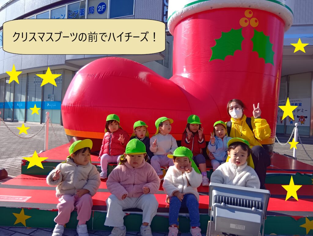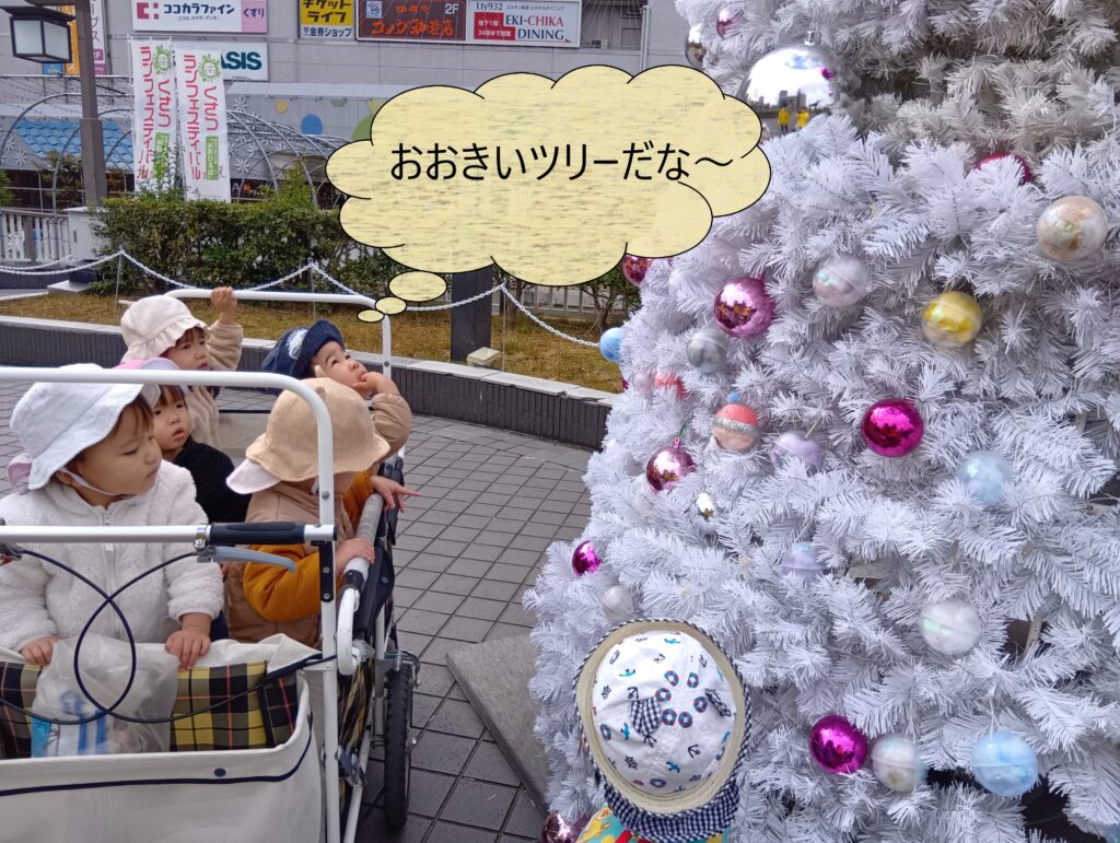 園周辺においても、11月の早い時期からクリスマスツリーやイルミネーションが飾られていて、園から散歩した際にも、みんなでクリスマスツリーを見ていました。