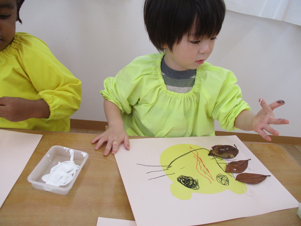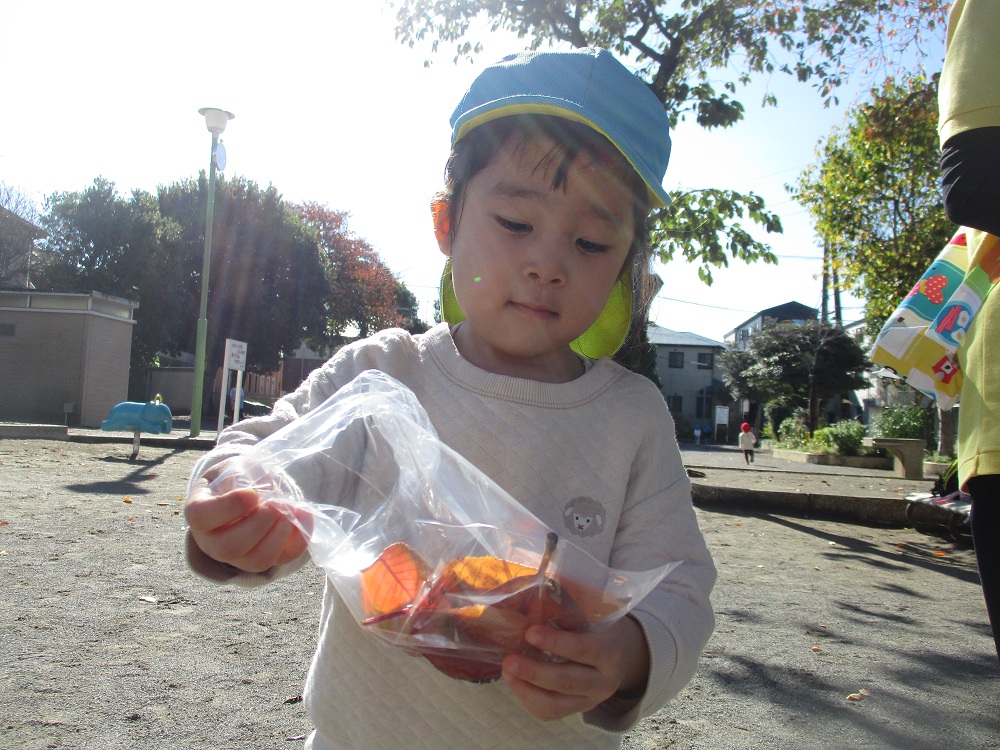 2歳児クラスでは公園でたくさんの葉っぱ集めから始まりました。