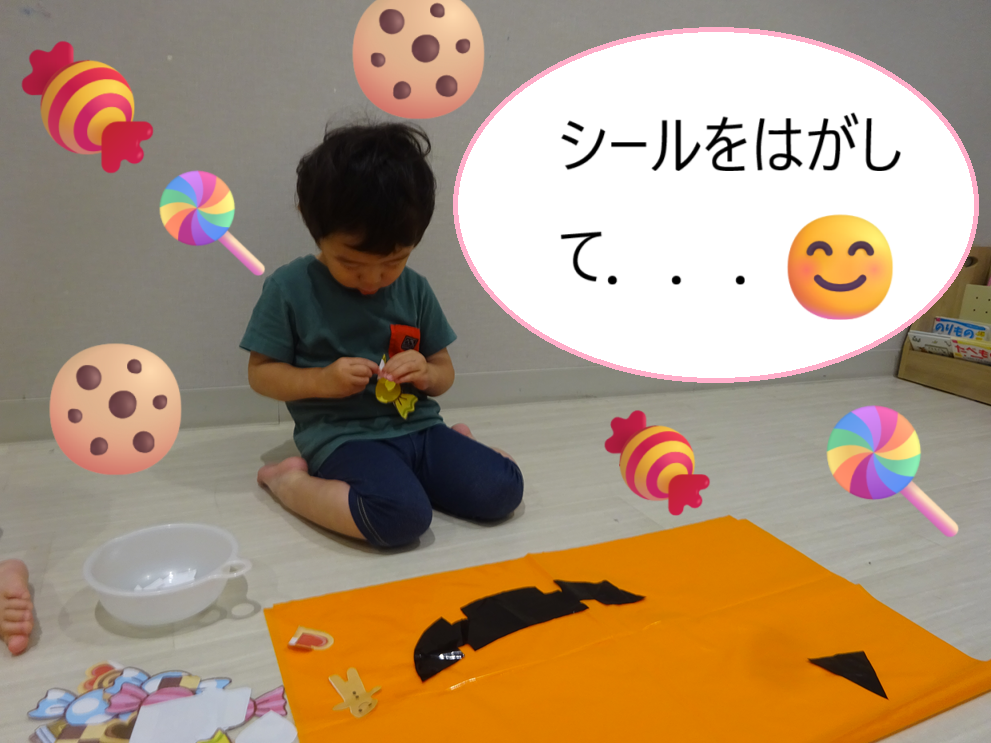 色や形を意識して、好きな色や形を自由に貼ったり、紙の裏の小さなテープの剥離をするために集中して指先を使うところがポイントです☝