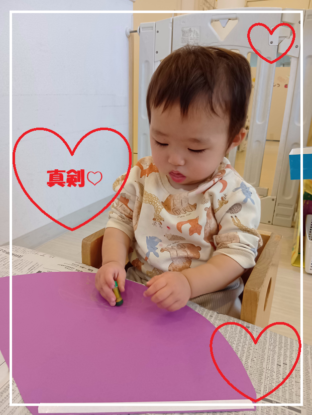 一生懸命クレヨンを持ってなぐり書きをしています。