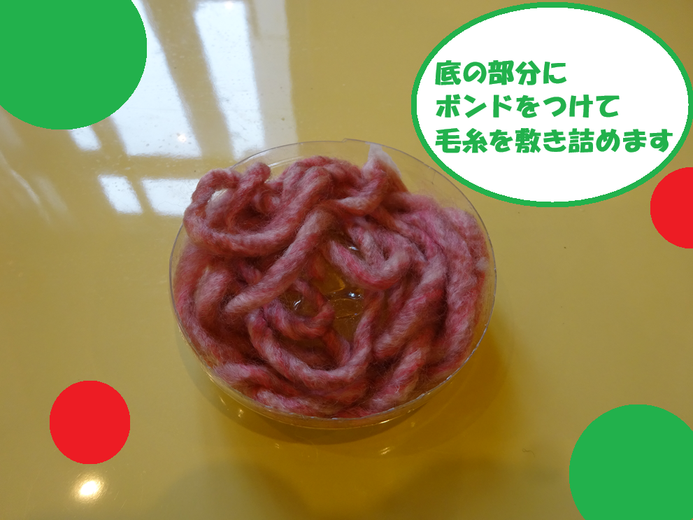 カットした底の部分にボンドを塗り、綿と松ぼっくりをくっつけます。