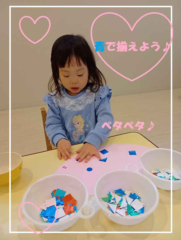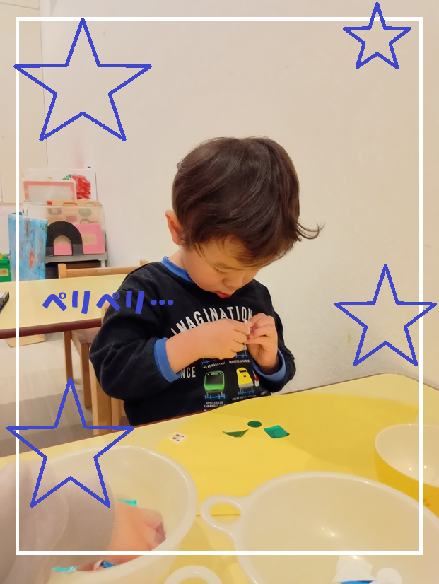 色や形を意識して、好きな色や形を自由に貼ったり、紙の裏の小さなテープの剥離をするために集中して指先を使うところがポイントです☝