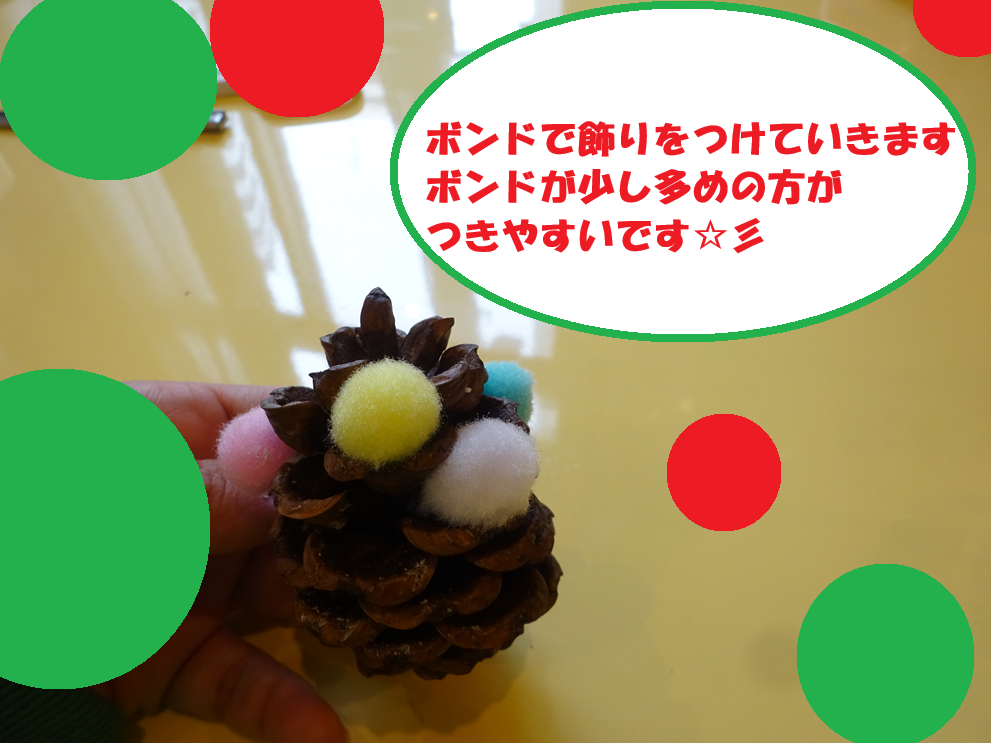 デコレーションボールにボンドをつけてもいいですし、松ぼっくりにボンドをつけてデコレーションボールを飾りつけても大丈夫です👍