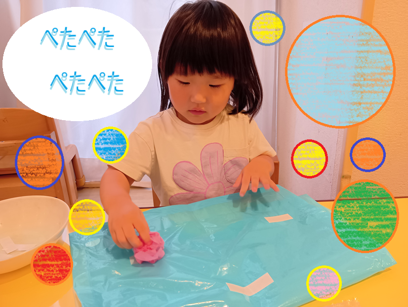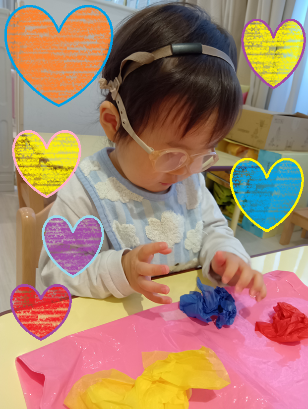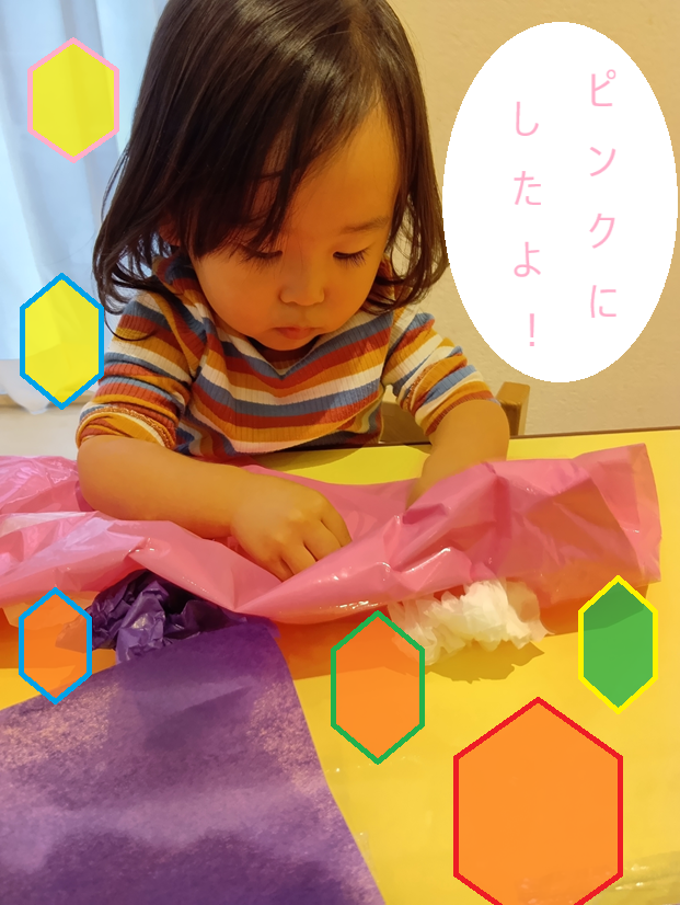 お花紙を丸めて飾りつけをしました!