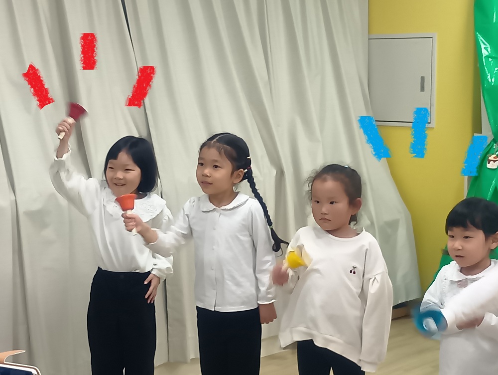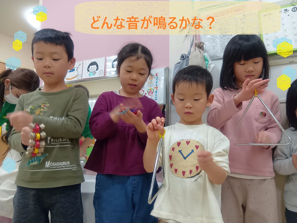 楽器の扱い方や約束事を最初に確認してから、自由に音を鳴らしたりお友だちと揃えてリズム打ちをしたりしています🎶