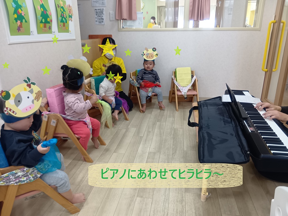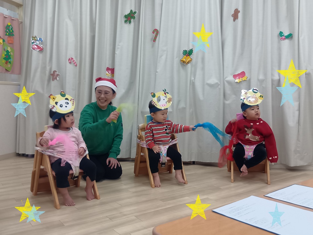 まだ手や身体が小さい0歳児クラスや1歳児クラスでは小さな手でも持ちやすいスカーフや手作りのマラカスを使って、楽しんでいます。