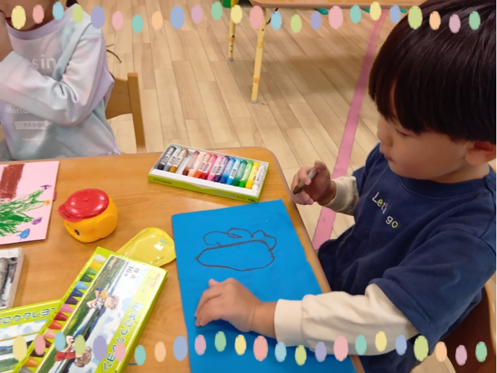 「ツリー描く!!」「サンタさんがプレゼント持ってきてくれるところ描くんだ!」と楽しい想像を絵として表現していました。