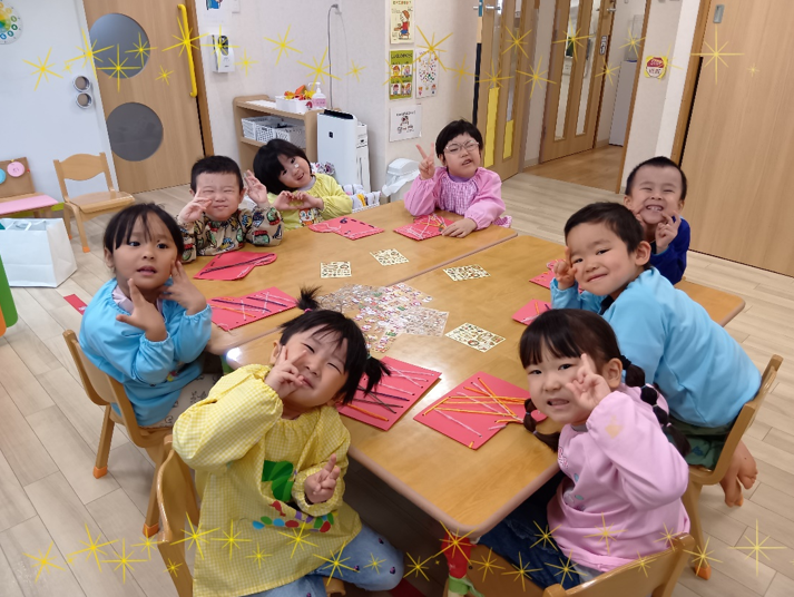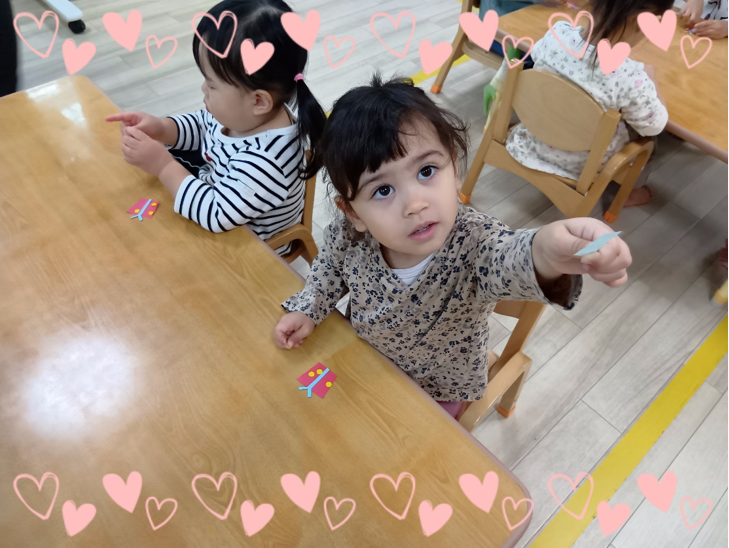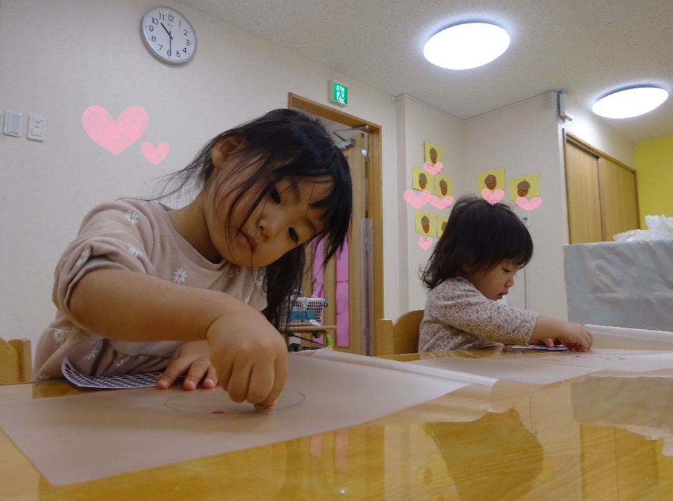 以前は台紙からシールを剥がすのが難しく、先生たちと一緒に挑戦する子どもたちでしたが、最近では自分で台紙からシールを上手に剥がすことができるようになりました😊