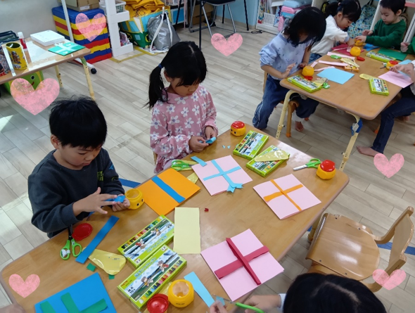 プレゼントの箱を作り、ハサミで好きな模様を切ったあとに、クリスマスの絵を描いて楽しみました。