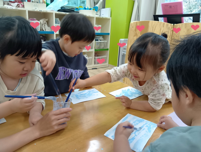 その上から絵の具を塗ると模様が浮き上がってきて「わぁ~!」と驚いた表情をしていました☺️