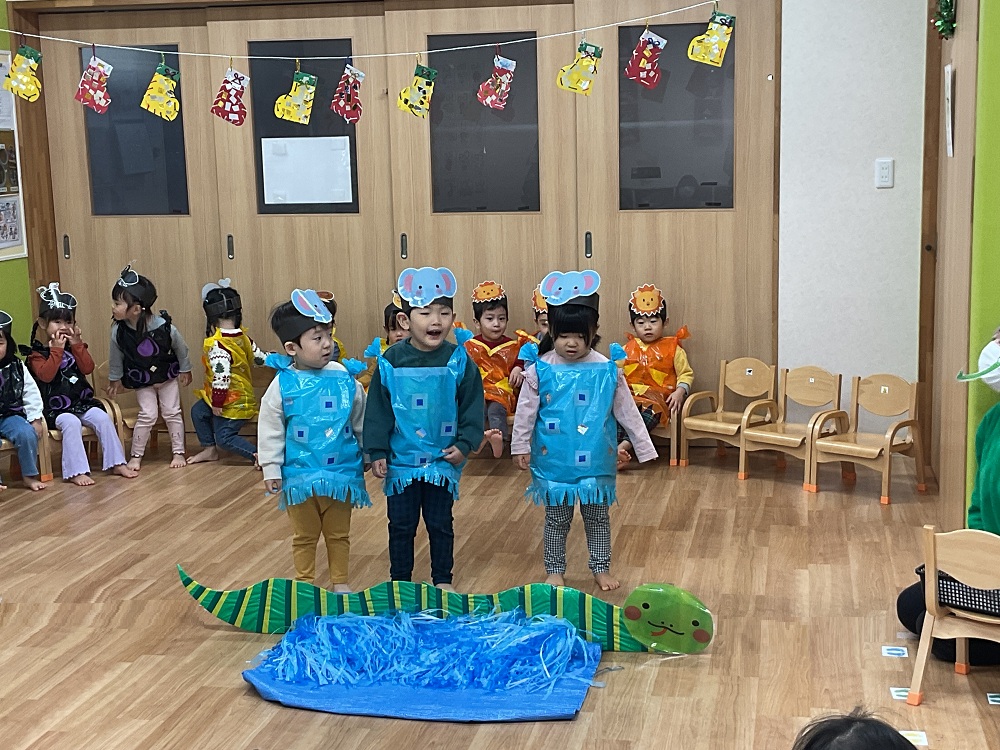 劇遊びのほか、カスタネットなどを使った合奏や、“うさぎのはらのクリスマス”の歌も披露してくれました🐰