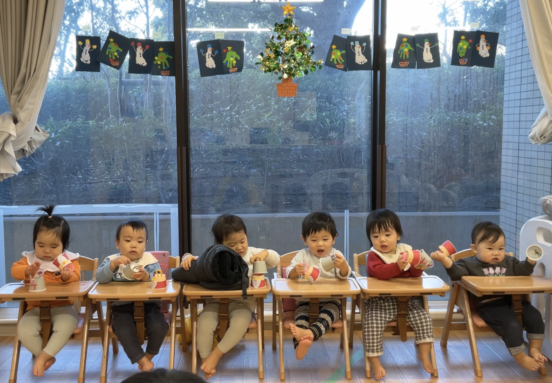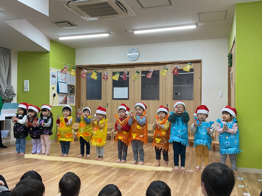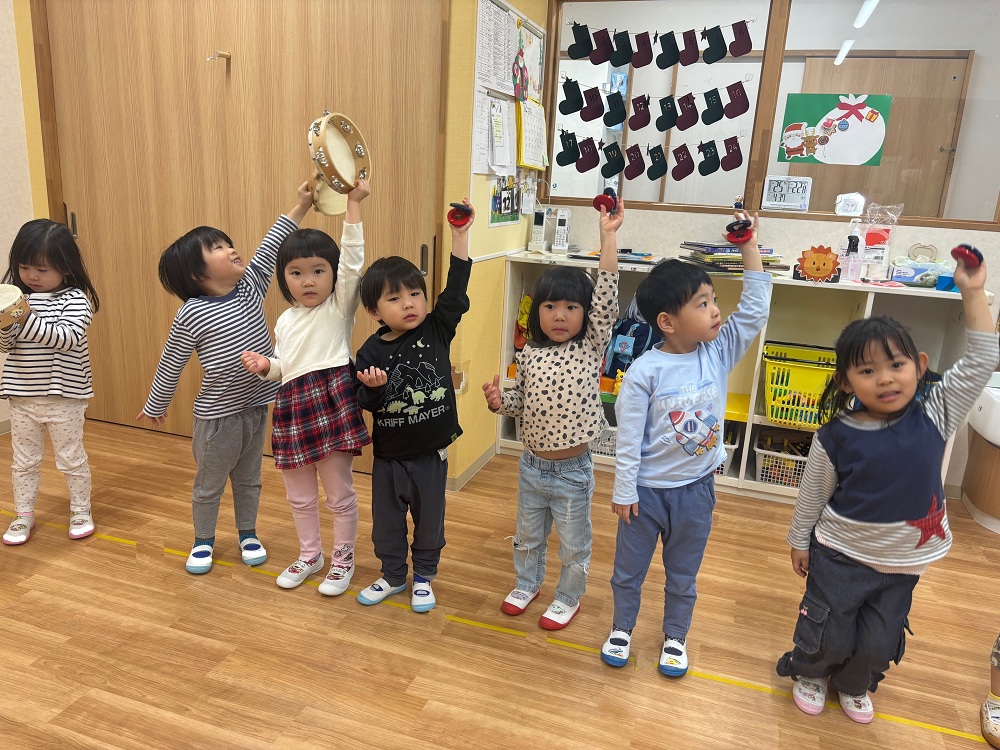そのほか、“あわてんぼうのサンタクロース”などの歌に合わせてタンバリンを叩いたり、鈴を振ったりして音楽に触れました♪
