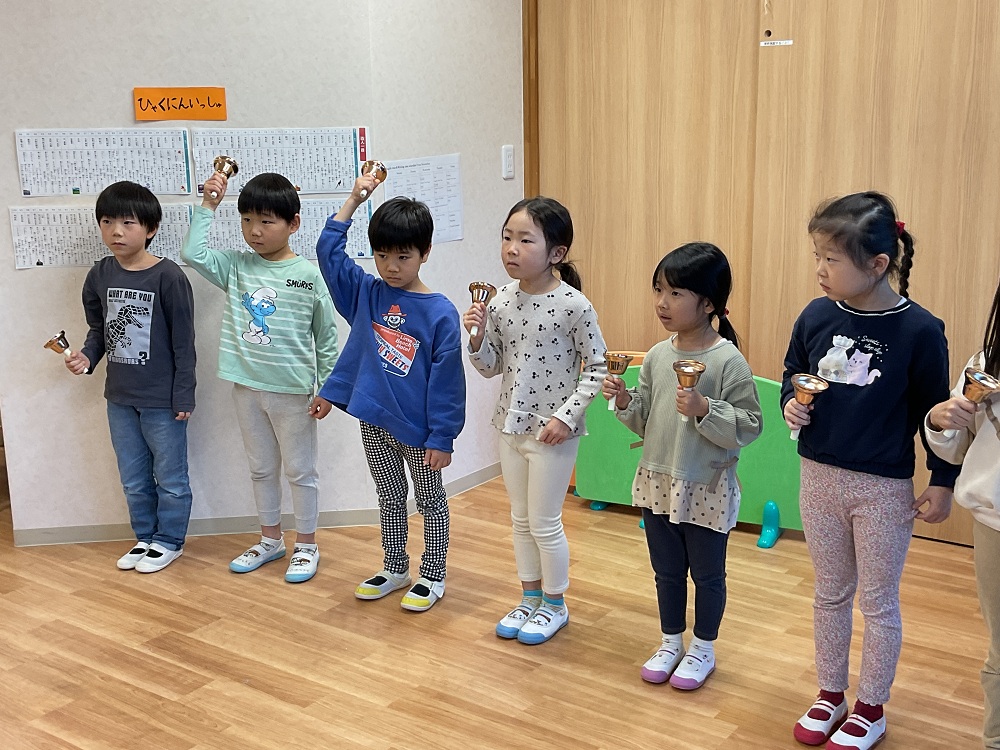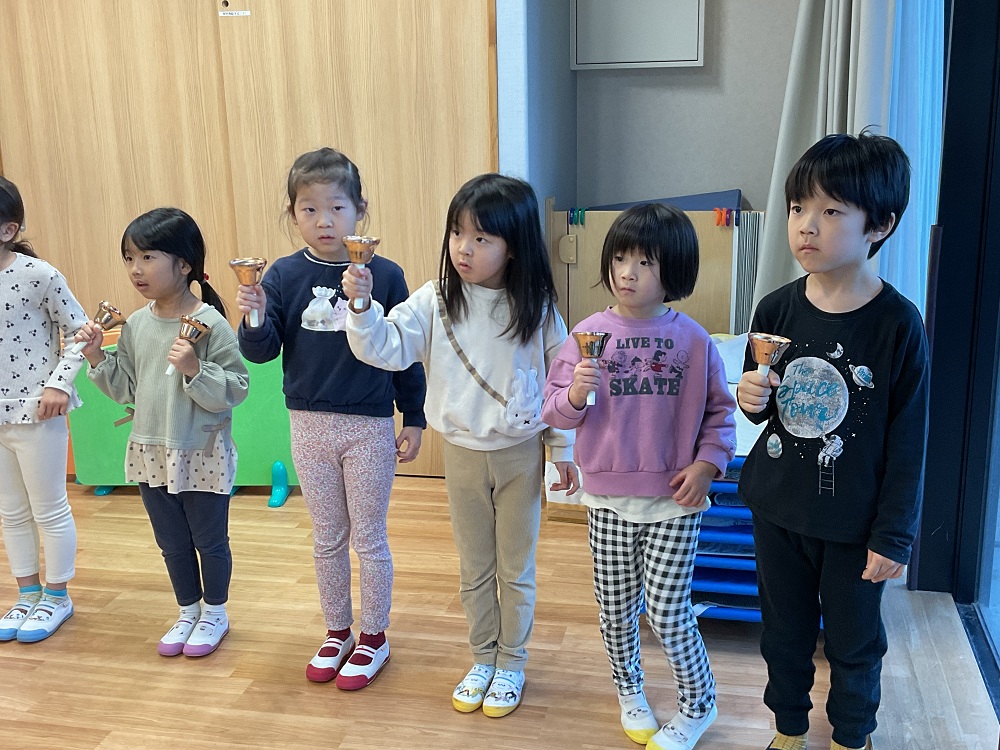 ハンドベルを持って、一人ずつ順番に音を鳴らして音階をつくったり、「ウィーウイッシュアメリークリスマス」「オーバーザレインボー」の曲を演奏したりして音楽に触れました🔔