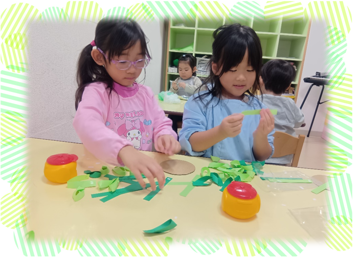 細長く切られた画用紙をひねって貼り付けたのですが、ひねるのが難しかったようで集中して取り組む姿が見られました🤔