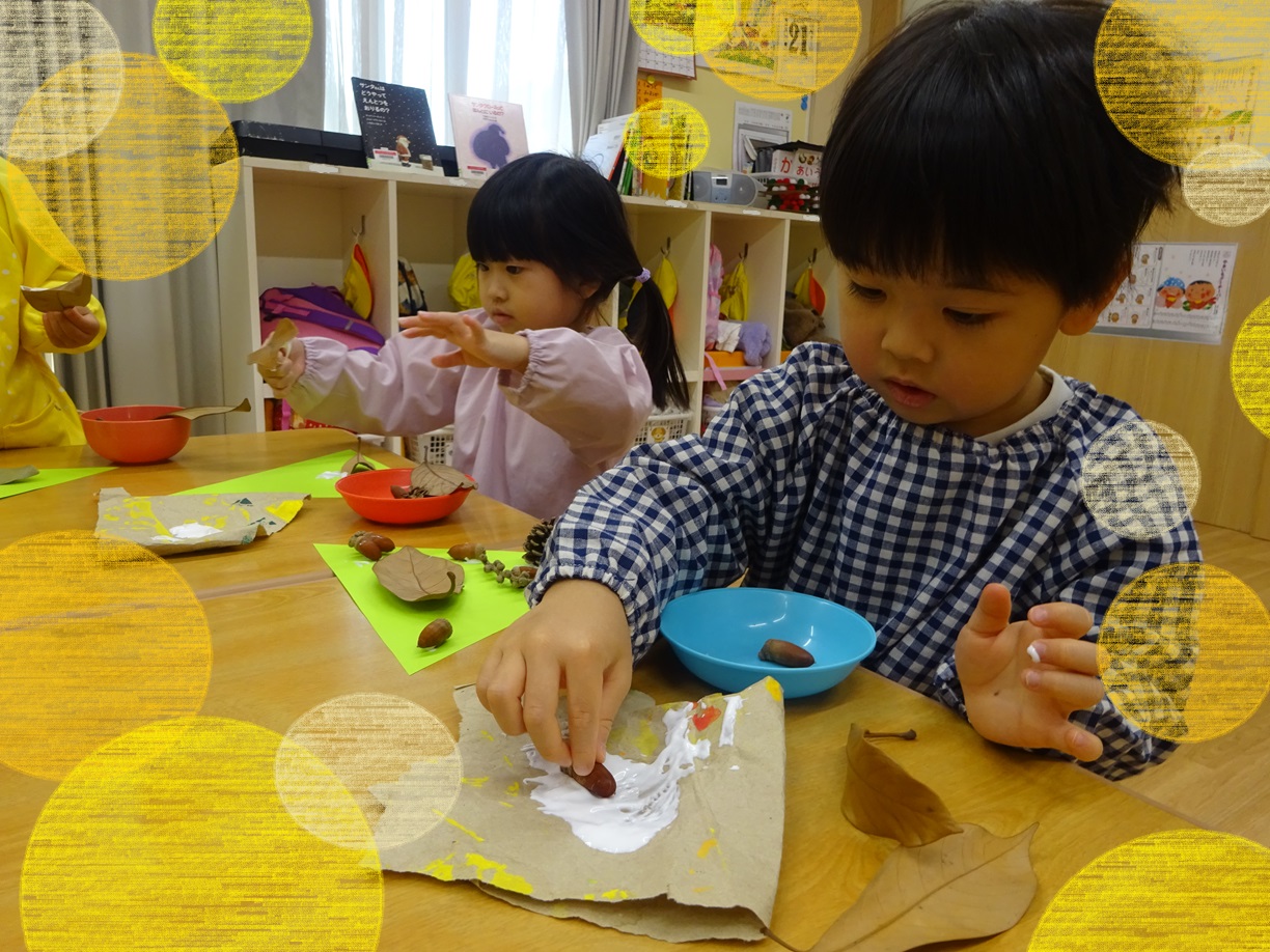 他にも公園で集めた落ち葉を用いた製作も今の季節ならではです♬