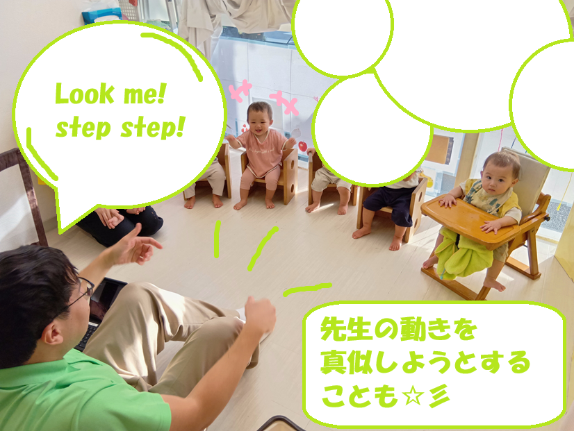 音楽に合わせて体を動かしたり、先生の様子をじーっとみて観察しています。