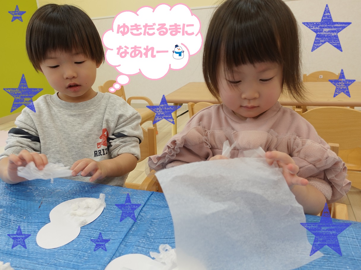 雪だるまは、花紙を丸めて雪だるまに糊で張り付け、色つきのボンボンもつけてとってもかわいい雪だるまが出来上がりました✨