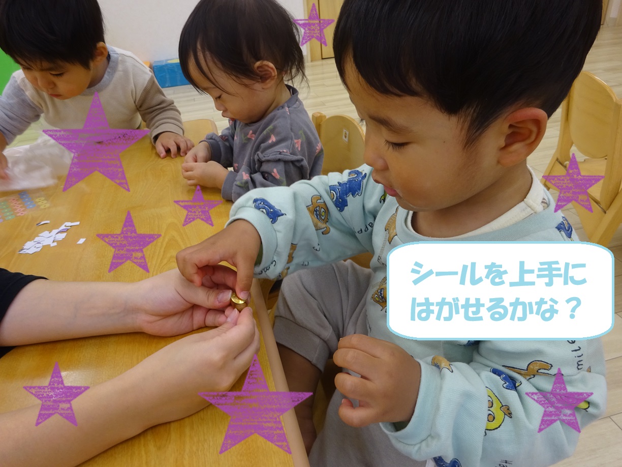 「こうやるんだよ」と見本を見せると、先生の真似をしながらペタペタシールを貼る子どもたち💕