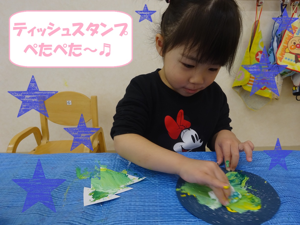 ツリー製作ではティッシュを丸めて絵の具をしみ込ませ、スタンプのように「ぺたぺた~!」と言いながら楽しそうに活動に取り組んでいました!