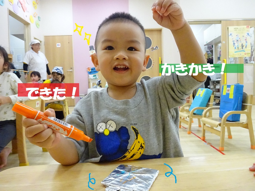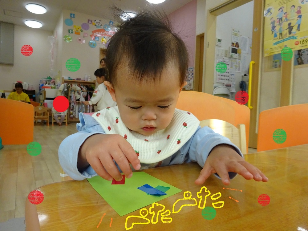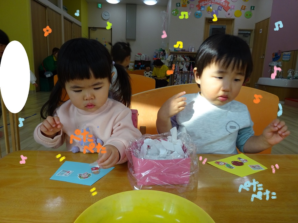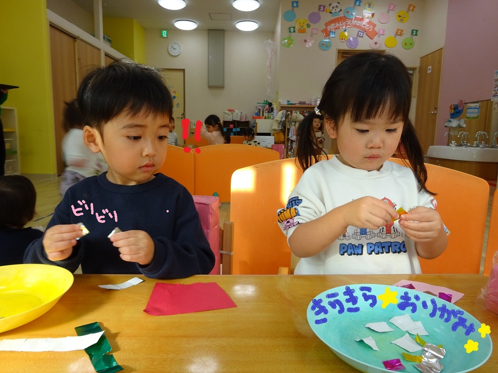 シリウス組(2歳児)さんは、キラキラ折り紙をちぎって貼りました。