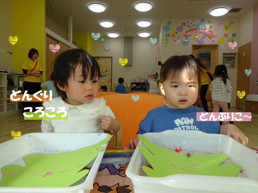 公園で拾ったどんぐりで、転がし絵を行いました。